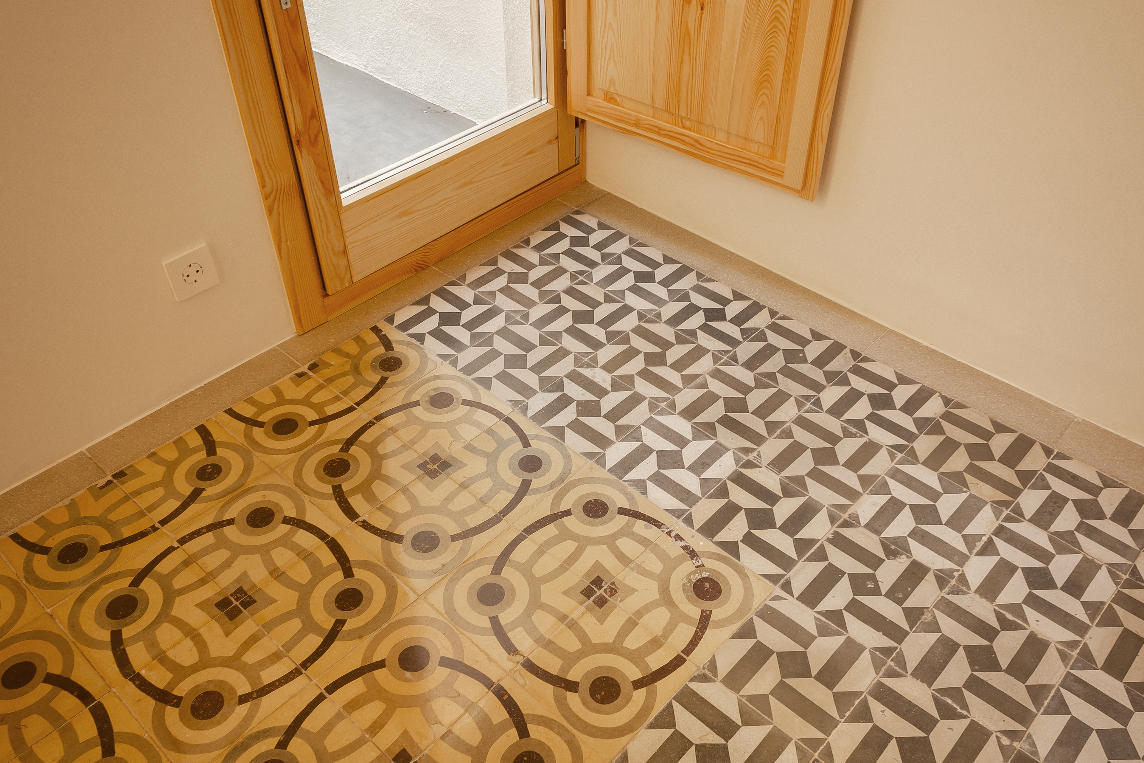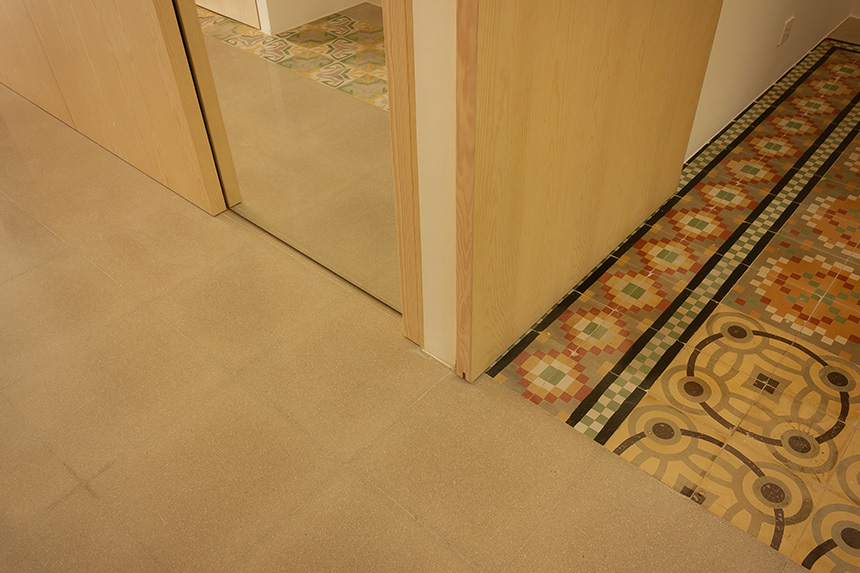 En ninguna estancia las baldosas conservadas están en el centro del espacio a modo de “alfombras”, en ningún caso se busca jerarquizar los espacios. Estas baldosas se fraccionan creando nuevas tramas de colores que desdibujan las estancias previas a su reforma, van apareciendo, bailan entre el nuevo pavimento.